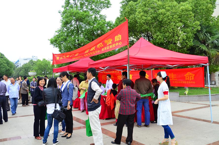 5月31日,省衛(wèi)生廳、省疾病預(yù)防控制中心、省婦幼保健所、合肥市衛(wèi)生局、合肥市疾病預(yù)防控制中心、包河區(qū)衛(wèi)生局、包河區(qū)疾病預(yù)防控制中心聯(lián)合在包河區(qū)銀杏苑社區(qū)廣場(chǎng)開展了宣傳咨詢活動(dòng)。來自各單位的健康教育、慢病防治、臨床醫(yī)療等方面的專家通過現(xiàn)場(chǎng)義診、咨詢、征集簽名、發(fā)放宣傳材料、展出展板等形式開展煙草危害宣傳和戒煙技巧指導(dǎo)。省衛(wèi)生廳婦社處相關(guān)負(fù)責(zé)人、合肥市、包河區(qū)衛(wèi)生局等單位的領(lǐng)導(dǎo)也現(xiàn)場(chǎng)參與宣傳活動(dòng)。多家新聞媒體參與了活動(dòng)的宣傳報(bào)道。據(jù)不完全統(tǒng)計(jì),此次活動(dòng)共接待咨詢?nèi)藬?shù)達(dá)到300多人,發(fā)放控?zé)熜麄鳟、折頁等各類宣傳材?00多份。