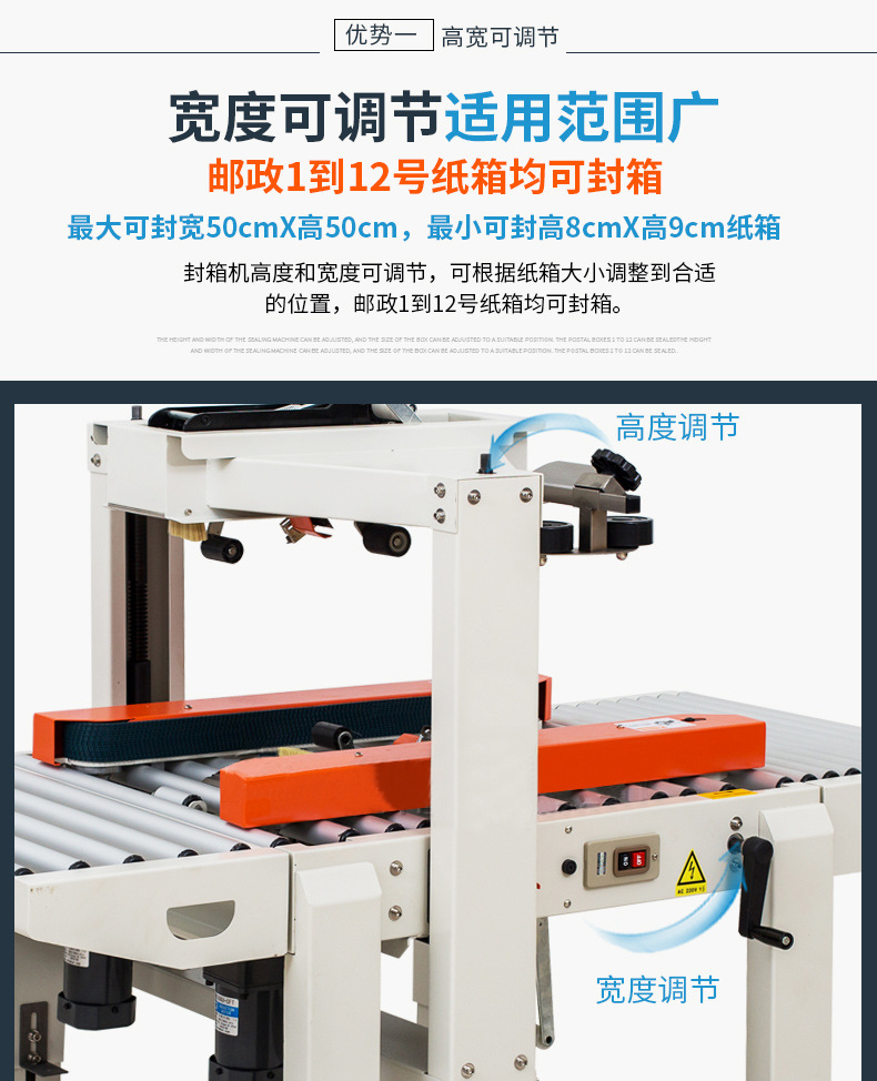 全自動封箱機1-12號小紙箱封箱機可以適應不同尺寸和形狀的紙箱,通過調整設備的參數,可以滿足不同客戶的需求
