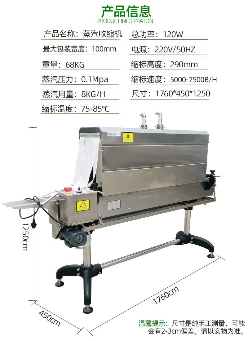 小型蒸汽收縮機(jī)的體積通常較小,便于放置在各種工作場(chǎng)所。它們的占地面積小,有的甚至可以放置在桌面上,不占用過多的空間。這對(duì)于小型店鋪、手工作坊或者辦公區(qū)域內(nèi)的臨時(shí)包裝任務(wù)來說非常方便。例如,一些小型禮品店可以將其放在柜臺(tái)后面,在顧客購(gòu)買禮品后,立即進(jìn)行包裝。 操作簡(jiǎn)便 這類機(jī)器的操作相對(duì)簡(jiǎn)單,容易上手。一般具有簡(jiǎn)潔明了的控制面板,操作人員可以輕松地設(shè)置蒸汽溫度、收縮時(shí)間和傳送帶速度等基本參數(shù)。通常不需要復(fù)雜的培訓(xùn)就能掌握其操作方法,降低了人力成本和培訓(xùn)時(shí)間。 節(jié)能高效 由于小型蒸汽收縮機(jī)的蒸汽腔室和加熱系統(tǒng)