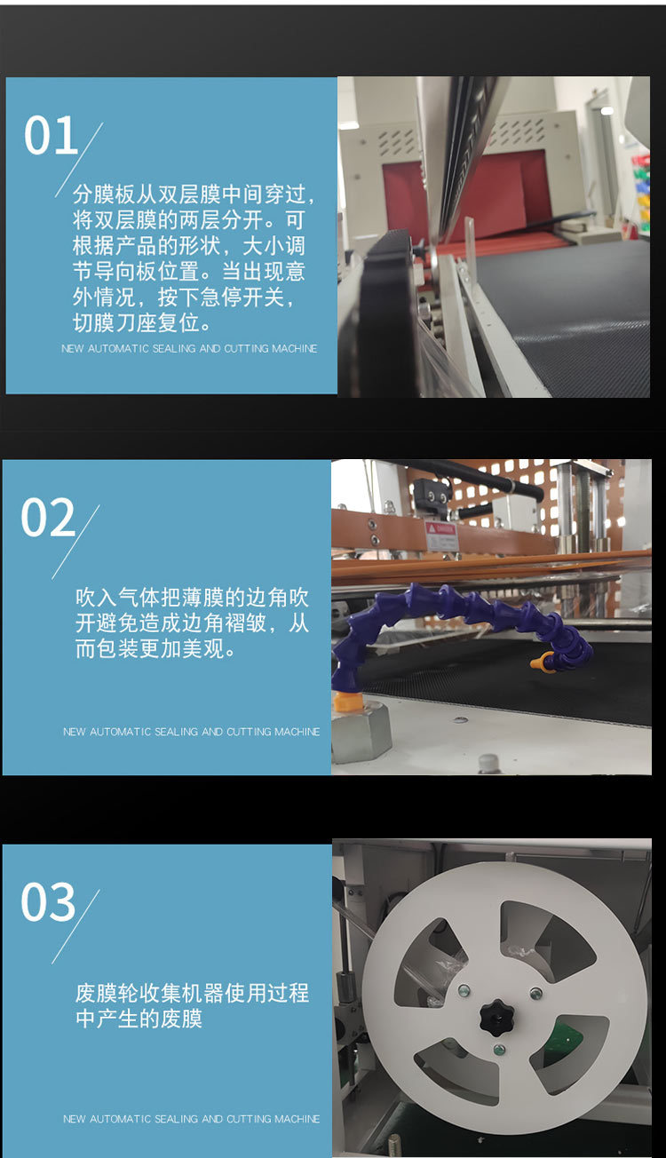 - 包裝品質高:采用先進的封刀系統和優質的電器元件,確保封口牢固、不開裂、不焦化、不冒煙,實現零污染,同時保證了機器的穩定性和耐用性。