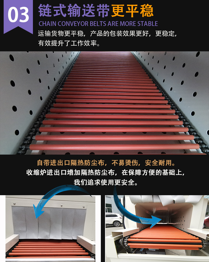 1. 輸送帶:負責將待包裝物品平穩地輸送通過各個工作區域,如套膜區、加熱區等。輸送帶的速度通常是可調節的,以便適應不同的包裝速度要求。