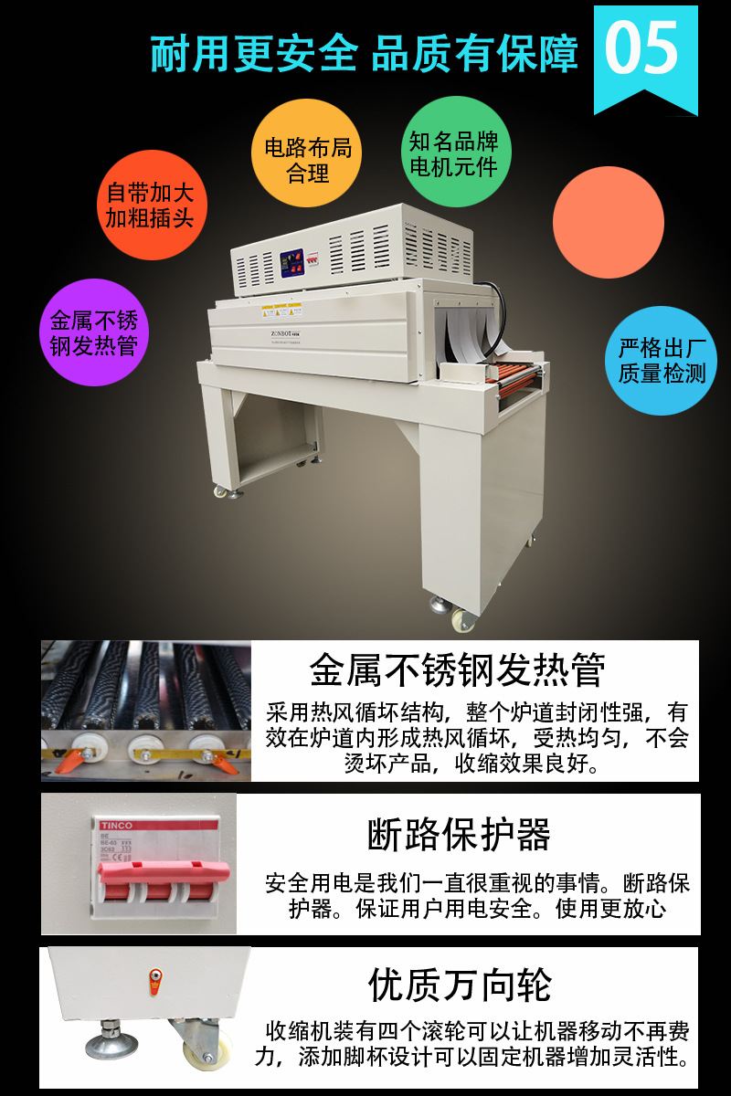 4. 加熱系統:考察熱收縮包裝機的加熱系統,包括加熱元件的類型、溫度控制的精度等。優質的加熱系統能夠提供穩定的加熱溫度,確保熱收縮薄膜的收縮效果良好,所以要選擇加熱元件性能好、溫度控制精度高的設備。