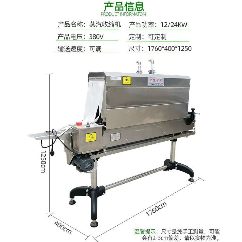 - 根據待包裝物品的最大尺寸(包括長度、寬度、高度等)來選擇合適型號的蒸汽收縮機,確保輸送系統、蒸汽加熱系統等能滿足物品的包裝需求。