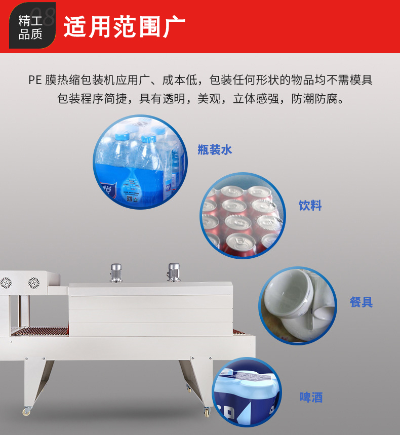 PE 薄膜本身具有良好的柔韌性,再加上 PE 熱收縮機(jī)可以通過(guò)調(diào)節(jié)輸送速度、加熱溫度等參數(shù),使得它能夠?qū)Ω鞣N形狀(如圓形、方形、不規(guī)則形狀)和尺寸的產(chǎn)品進(jìn)行包裝。例如,無(wú)論是包裝小型的文具,還是大型的工業(yè)零部件,PE 熱收縮機(jī)都能發(fā)揮作用。