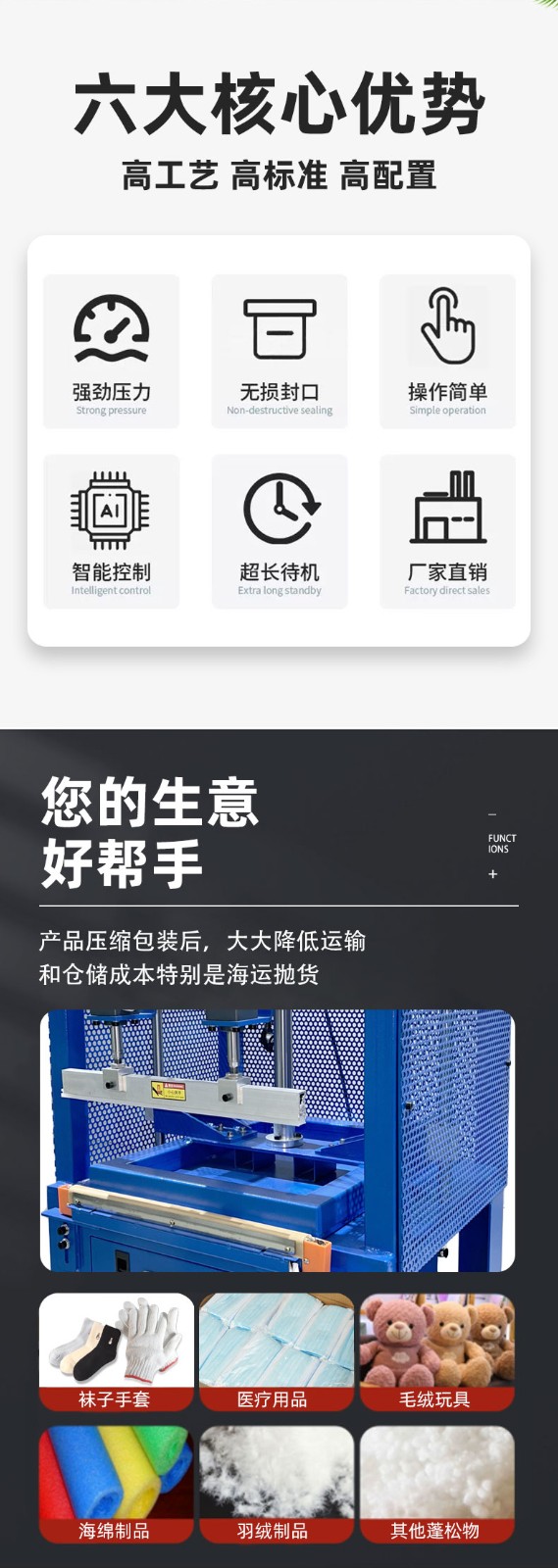 - 半自動壓縮封口包裝機:需要人工將物品放入包裝袋,然后啟動機器進行壓縮和封口操作。這類機器價格相對較低,操作靈活,適用于小批量生產或對包裝速度要求不高的企業。