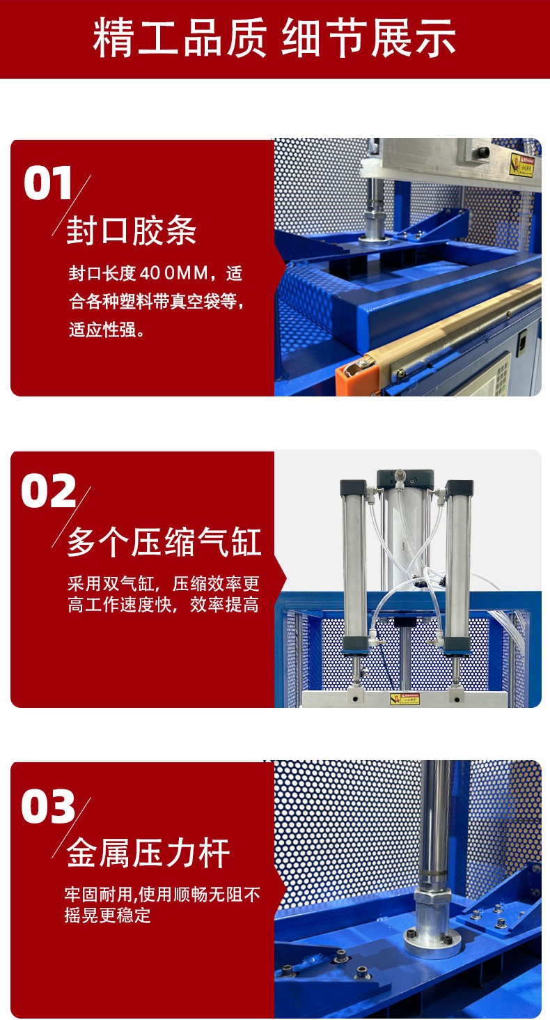 壓縮原理:依靠機械傳動、氣動或液壓系統產生壓力。當物品被放置在包裝位置后,機器的壓縮裝置會對其施加外力,擠壓包裝袋內的空氣,使物品被壓縮,達到減小體積、便于包裝和運輸的目的。