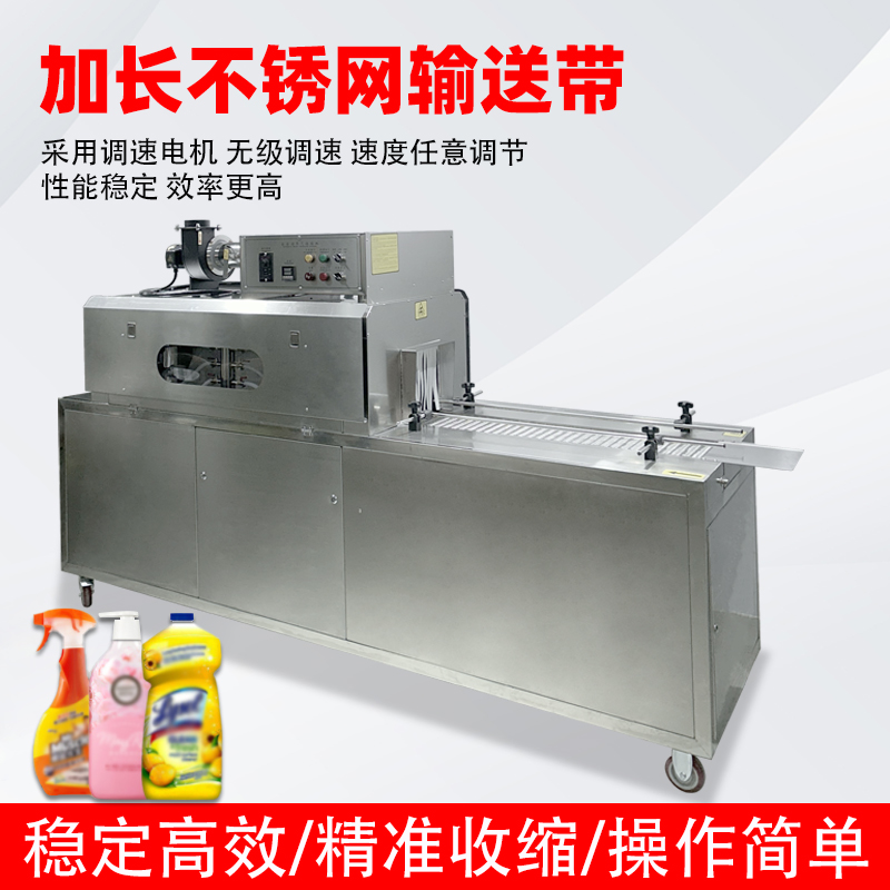 - 前期準備與輸送:先人工或自動化設備將套好收縮膜(如 PVC、PET 膜)的產品放置在輸送帶上,輸送帶通過無級調速系統啟動,將產品勻速送入收縮通道。