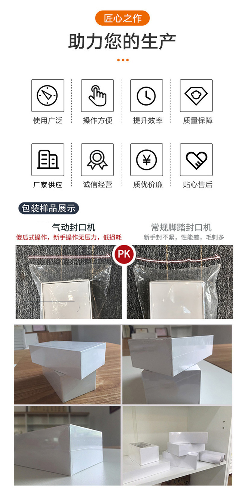 氣動封口機操作簡單、維護方便。它的操作界面簡潔明了,員工只需經過簡單的培訓即可上手操作。同時,氣動封口機的維護也非常方便,日常保養和故障排查都十分簡單,有效降低了企業的維護成本。