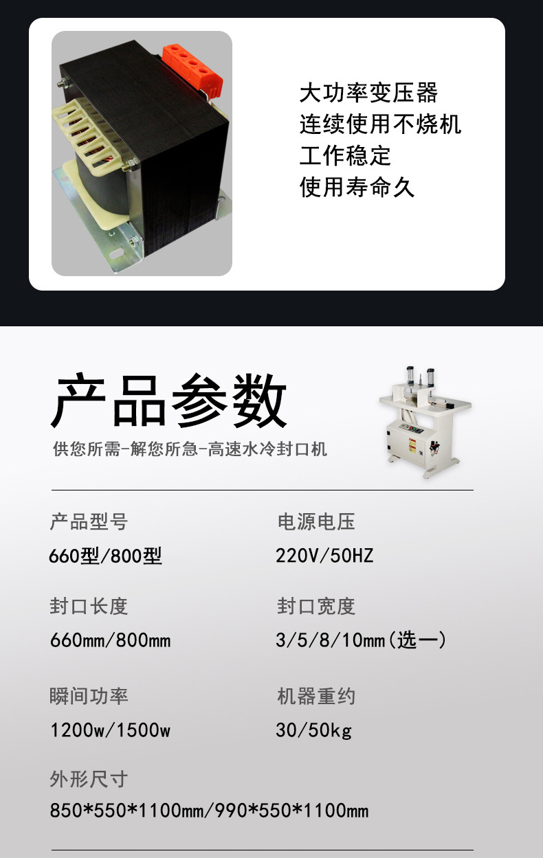 2.封口質(zhì)量穩(wěn)定:設(shè)備封口區(qū)域內(nèi)的溫度可控,能夠保證封口處溫度均勻,從而保證封口處的質(zhì)量。同時(shí),水冷卻系統(tǒng)能夠迅速降溫,保證封口處不會出現(xiàn)熱裂現(xiàn)象。
