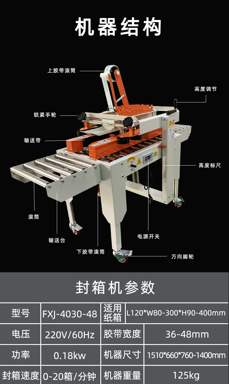 那么,封箱機是如何工作的呢?簡單來說,封箱機主要由以下幾個部分組成:送紙器、膠帶輸送器、封箱刀、切割器、調整器等。在使用封箱機之前,我們需要將紙箱放在送紙器上,然后讓封箱刀貼合在包裝箱的邊緣,進行封口操作。整個過程簡單、快捷,大大提高了我們的工作效率。