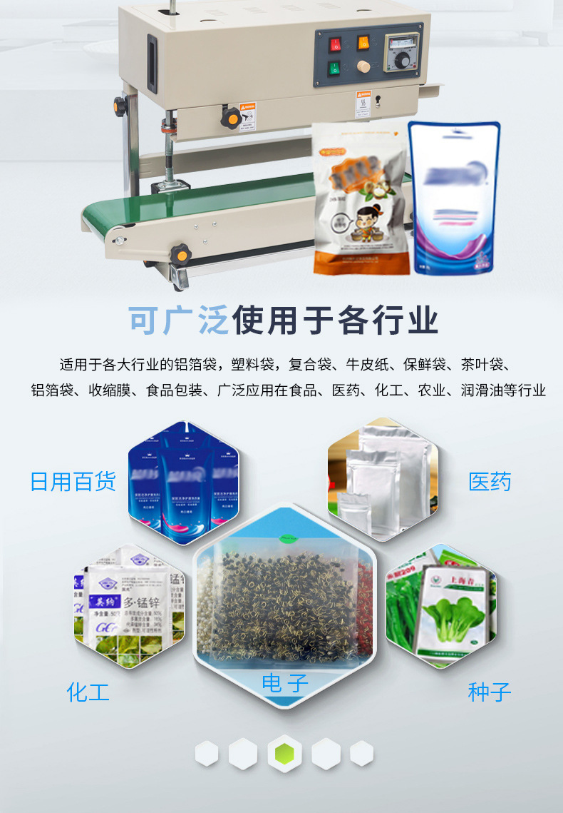 封口包裝機的主要功能是將充填有包裝物的容器進行封口。?這種機械在產品裝入包裝容器后,?通過不同的封口方式,?如遠紅外線輻射直接加熱PVC/POP收縮膜,?達到完美的收縮包裝效果,?從而實現密封、?防塵、?防潮和防盜性。?封口包裝機的應用范圍廣泛,?包括食品、?餐具、?熟食品、?肉類、?方便面、?面食、?飲料、?糖果、?文化用品、?超市商品、?五金工具、?日用百貨、?工藝品、?化工產品、?木制品、?印刷制品、?塑料制品、?玻璃制品、?電子元件等產品