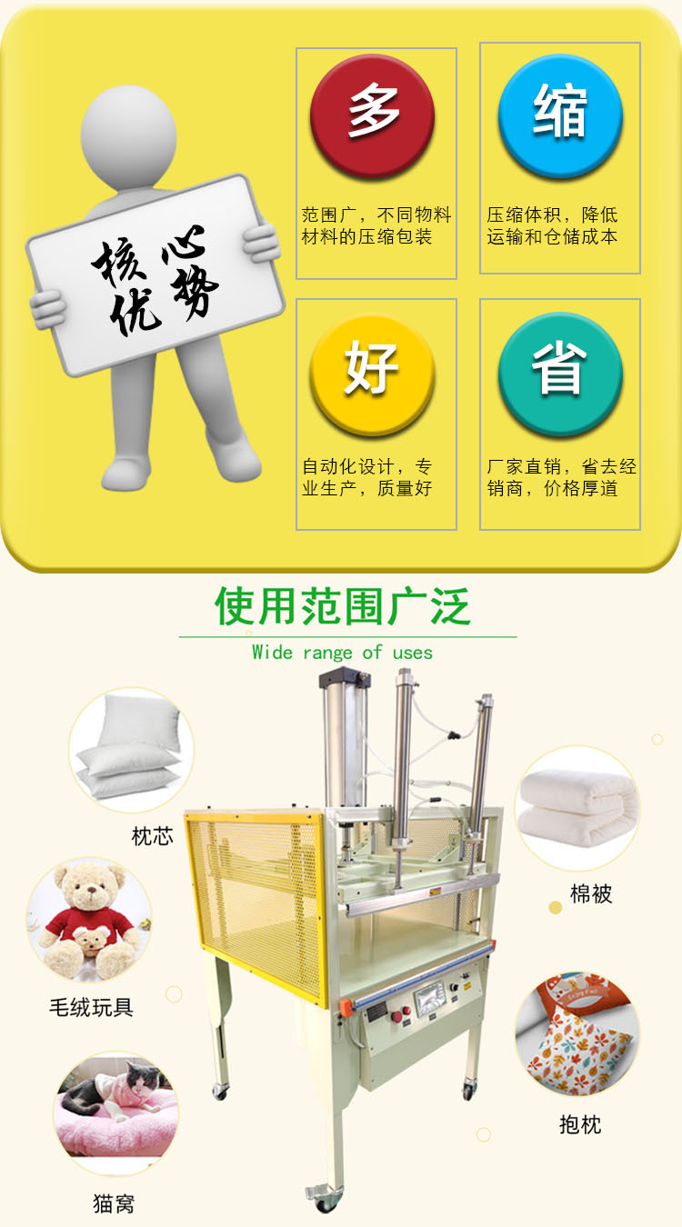 壓縮包裝封口機適用于壓縮包裝羽絨被服、太空棉被服、枕頭、發泡棉、毛巾等蓬松的其它物品。可縮小包裝的物品及防潮防塵
